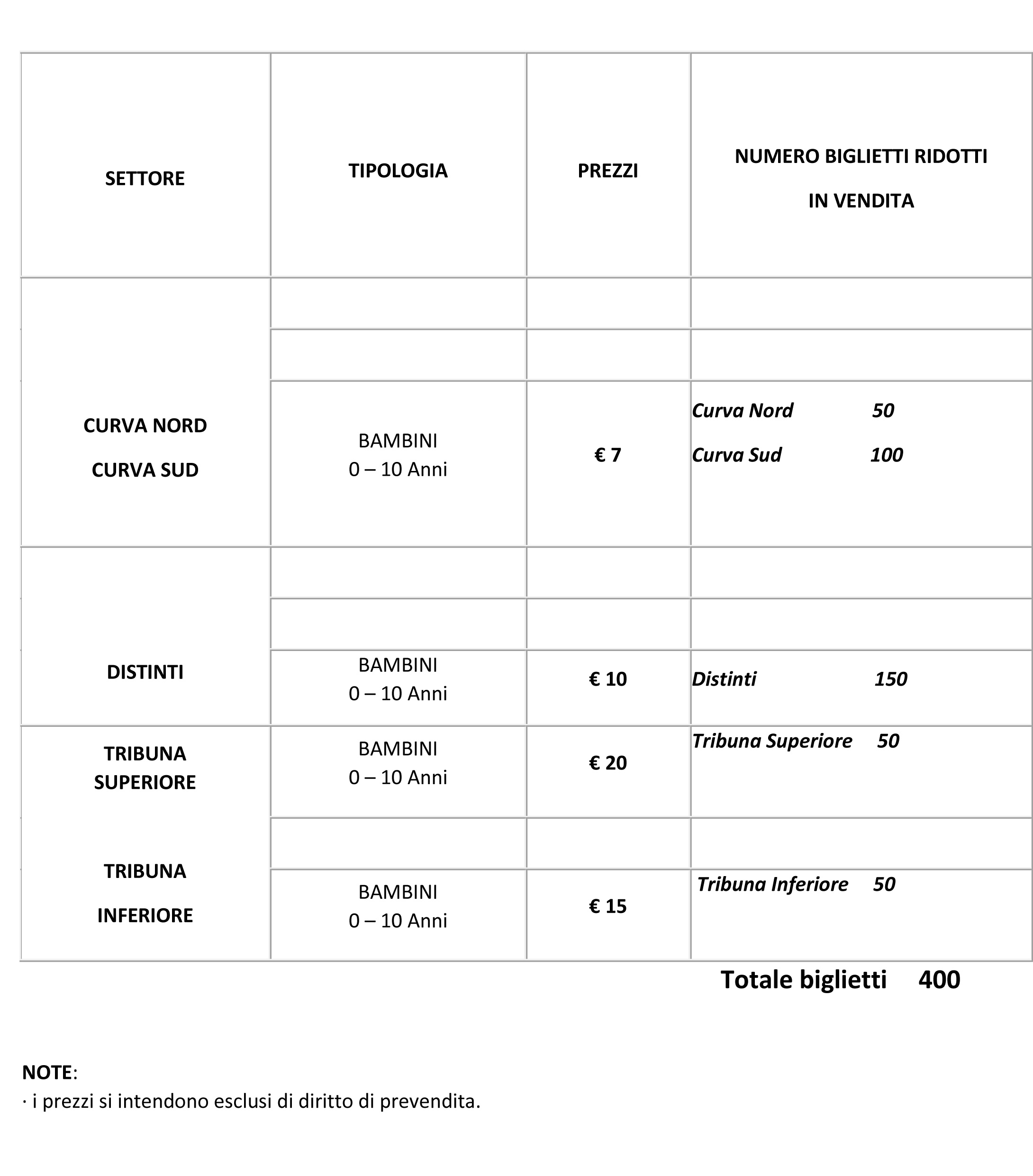 In allegato, i prezzi dei tagliandi Ridotti in questione ed il corrispondente numero di biglietti che sarà reso disponibile per la vendita.