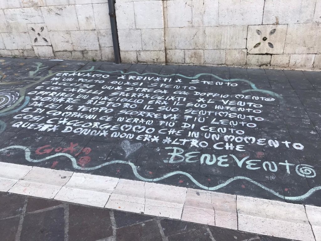 “Eravamo arrivati a stento in posto quasi spento. Ci accolse una strega col doppio mento e con i capelli sparpagliati dal vento. Offrirci un giaciglio era il suo intento”, questa una parte della breve poesia che si chiude con un vero omaggio alla città: “Così ci accorgemmo che in un momento questa donna non era altro che Benevento”.