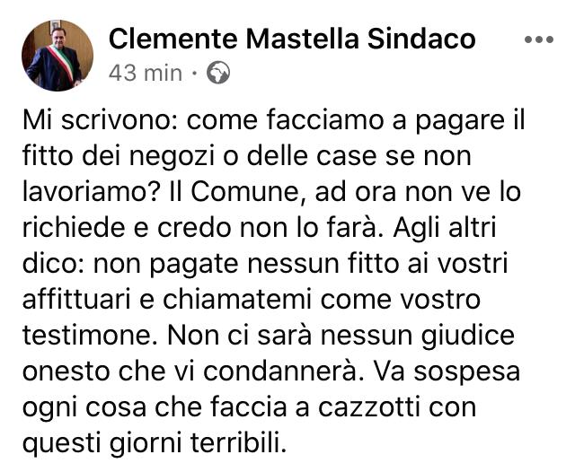 “Mi scrivono: come facciamo a pagare il fitto dei negozi o delle case se non lavoriamo? Il Comune, ad ora non ve lo richiede e credo non lo farà. Agli altri dico: non pagate nessun fitto ai vostri affittuari e chiamatemi come vostro testimone”. Lo scrive in un post su facebook il sindaco di Benevento, Clemente Mastella.