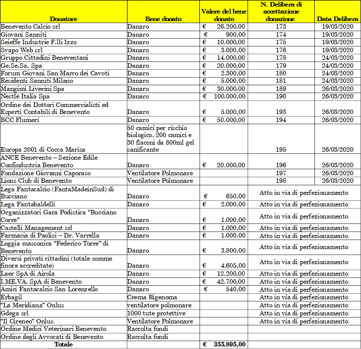 Il Direttore Generale, Dott. Mario Nicola Vittorio Ferrante, a nome dell’A.O.R.N. “San Pio” di Benevento, esprime la sua profonda gratitudine ai tanti cittadini, società ed enti, che, con generose donazioni, vanno supportando l’Azienda Ospedaliera per l’acquisto di dispositivi ed apparecchiature elettromedicali, che aiuteranno ad affrontare meglio la difficile situazione dovuta all’epidemia da covid-19.