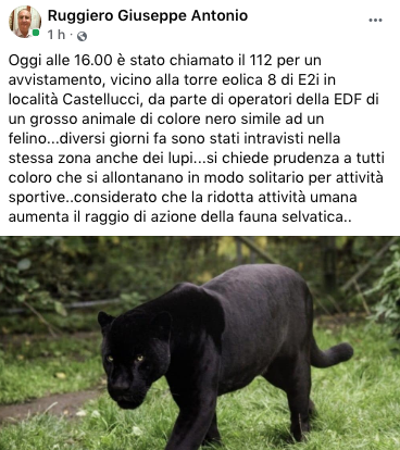 Oggi l’ennesimo annuncio, arrivato via facebook dal sindaco di Foiano di Val Fortore e consigliere provinciale Giuseppe Antonio Ruggiero. Secondo quanto si legge nel post, questo pomeriggio intorno alle 16 sono stati contattati i carabinieri per un avvistamento, vicino alla torre eolica 8 di E2i in località Castellucci, da parte di operatori della EDF di un grosso animale di colore nero simile ad un felino.
