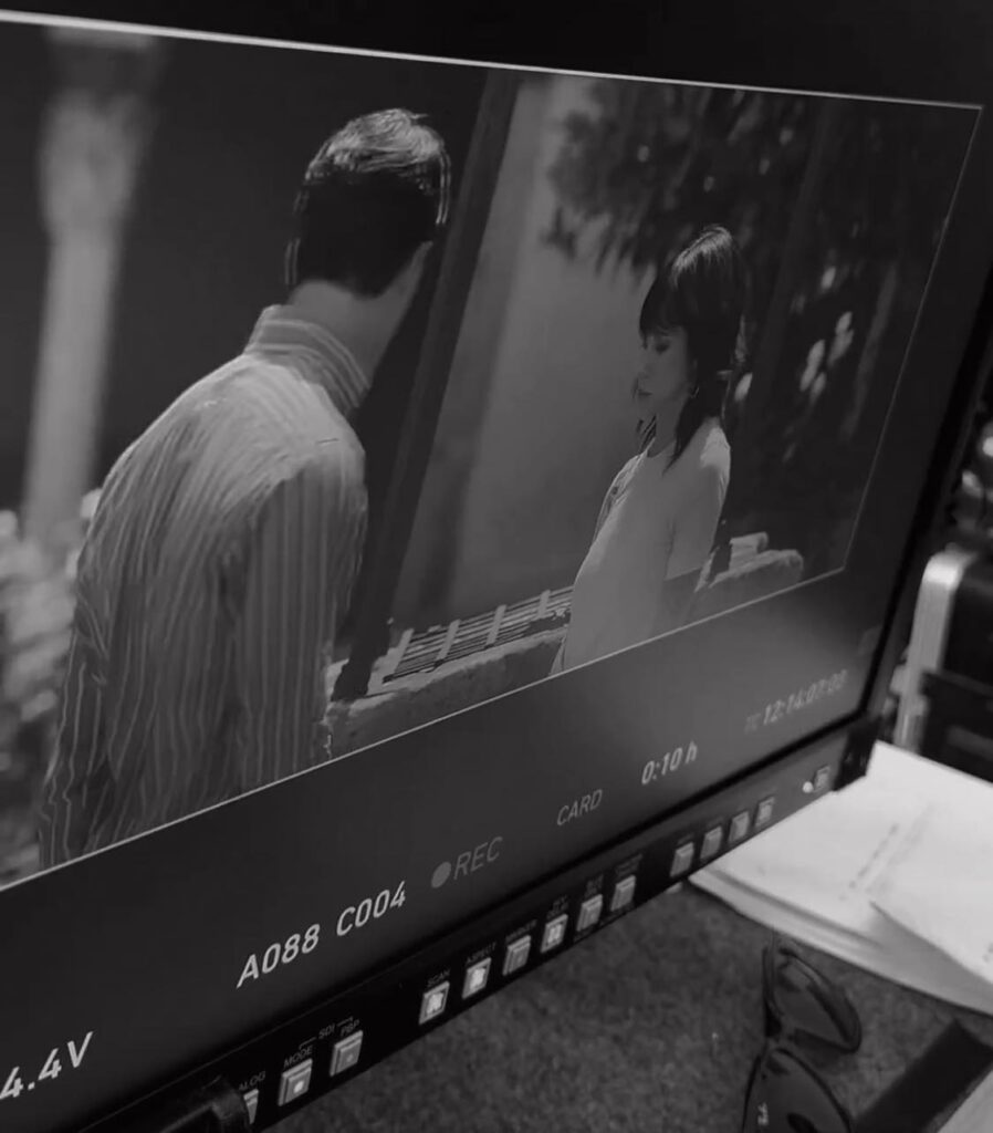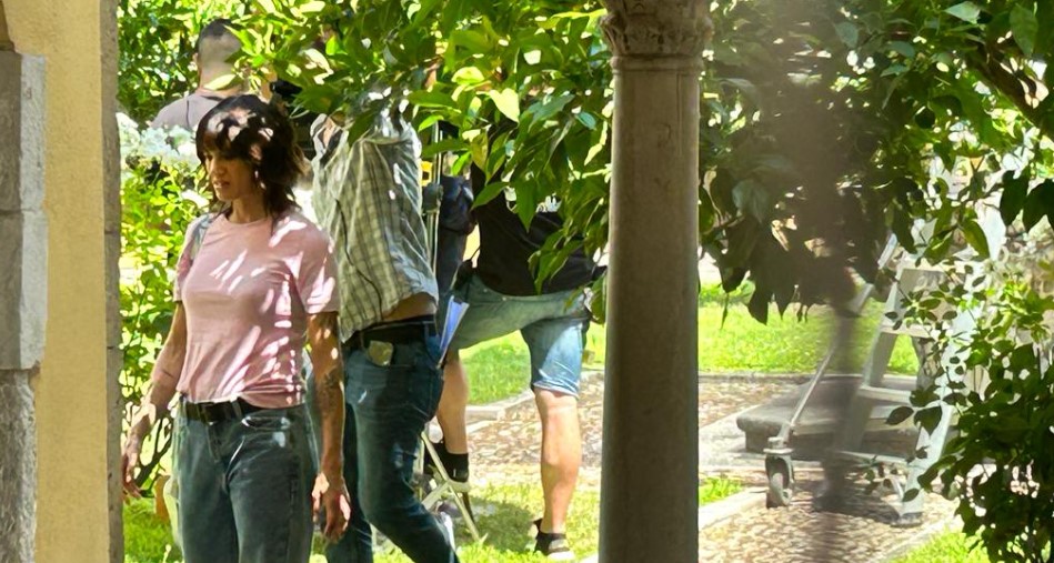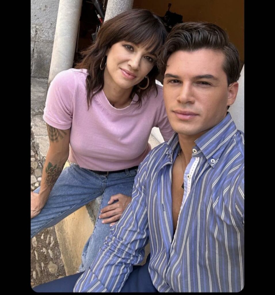Maglia rosa e jeans, l’artista – figlia del maestro del brivido Dario – sta girando alcune scene con il protagonista maschile, il modello e influencer Antonio Medugno.