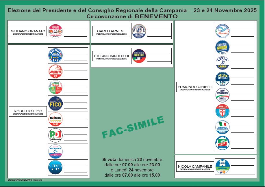 Sul lato destro della scheda elettorale figurerà invece lo schieramento a sostegno di Edmondo Cirielli e delle sue otto liste: in prima posizione Democrazia Cristiana di Gianfranco Rotondi, seguita dalla lista presidenziale di Edmondo Cirielli, poi la Lega di Salvini, Fratelli d’Italia con il nome della premier Meloni in bella evidenza, Noi Moderati, Unione di Centro e, dopo la lista civica Pensionati e Consumatori, ci sarà Forza Italia, che mantiene nel simbolo il richiamo al fondatore Silvio Berlusconi.