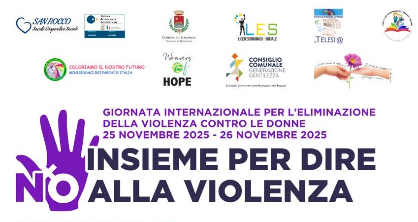 In occasione della Giornata internazionale per l’eliminazione della violenza contro le donne, il Comune di Solopaca e il SAI di Solopaca promuovono l’iniziativa “Insieme per dire NO alla violenza”, un percorso di educazione al rispetto e alla parità che coinvolgerà, nelle giornate di oggi e domani, 25 e 26 novembre 2025, la Scuola Primaria, la Scuola Secondaria di I grado e il Liceo Economico Sociale. Il progetto nasce dalla sinergia tra amministrazione comunale, istituzioni scolastiche e realtà del terzo settore, con la partecipazione della Cooperativa Sociale San Rocco, del progetto “Coloriamo il nostro futuro – Amministrate del Parco d’Italia”, dell’associazione Weavers of Hope, dell’Istituto Telesi@, del LES e del Consiglio Comunale dei Ragazzi e delle Ragazze “Generazione Gentilezza”.
