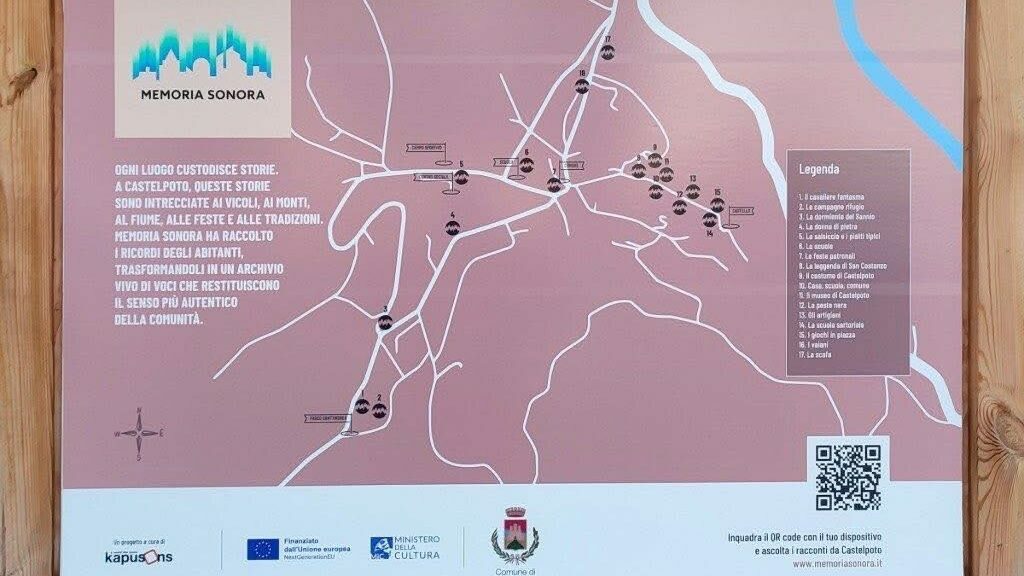 Per rendere il progetto subito fruibile, ieri a Castelpoto sono stati installati pannelli narrativi in vari punti del paese: tramite QR code rimandano al sito e al podcast che raccontano il territorio. Insieme alle mappe interattive, le storie diventano tappe di un percorso esperienziale che intreccia la memoria collettiva dei luoghi con la contemporaneità del linguaggio sonoro, restituendo identità, emozione e senso di appartenenza alle comunità locali.