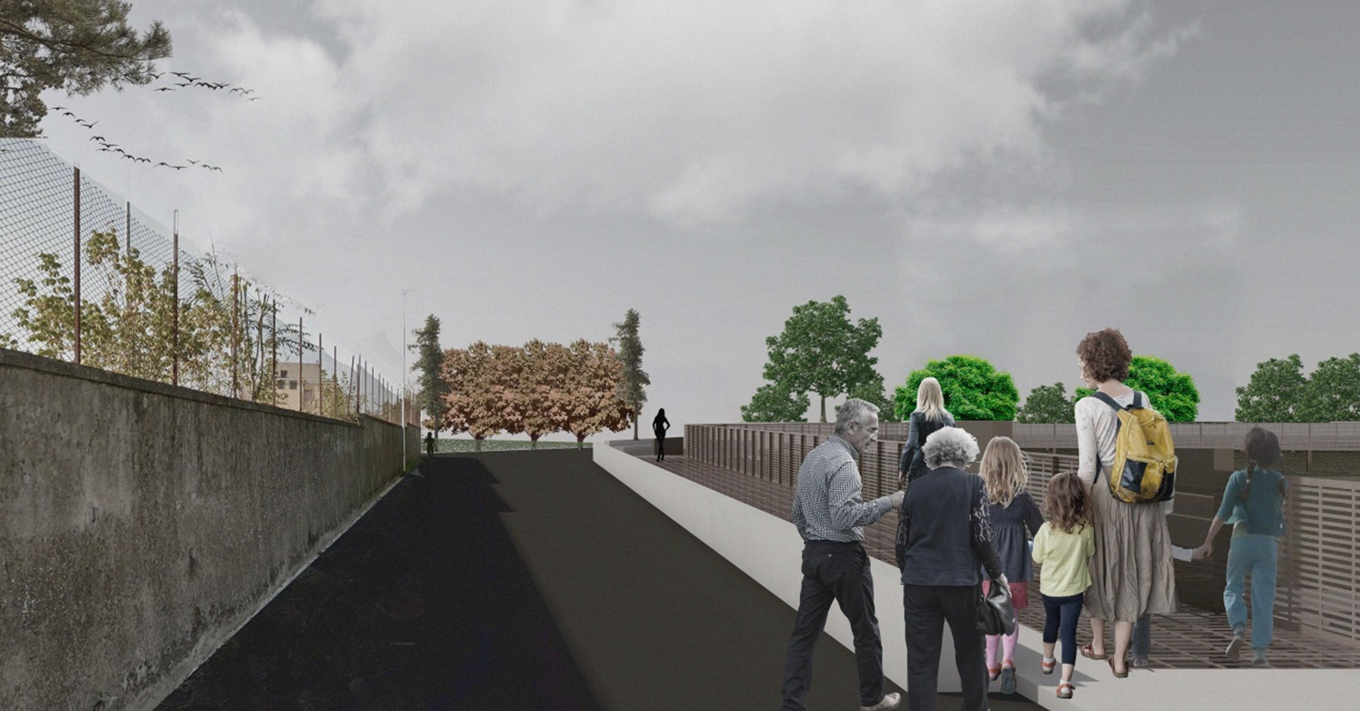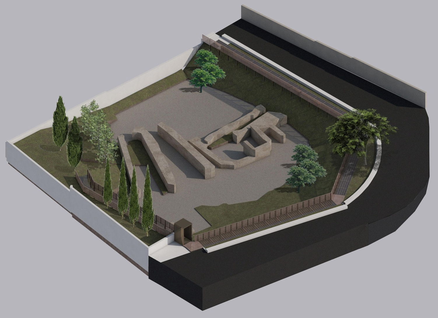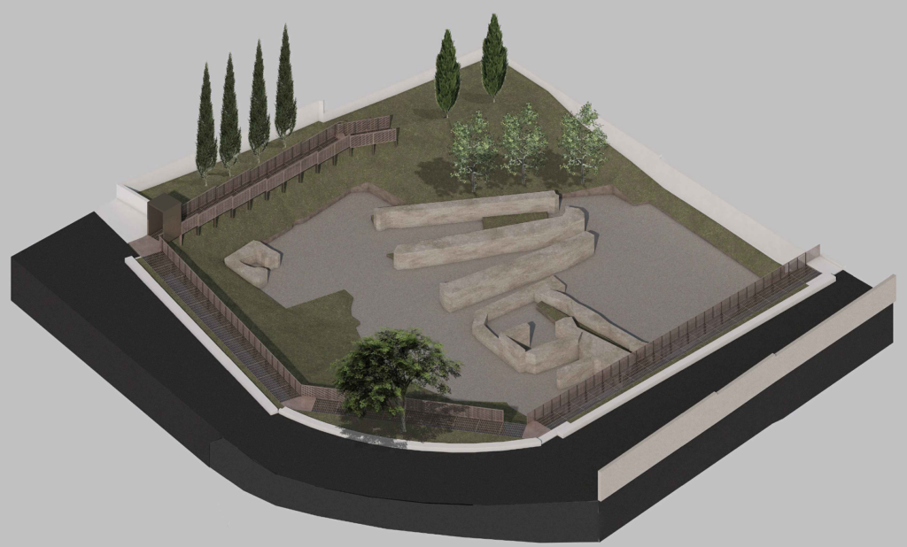 Cuore dell’intervento sarà la realizzazione di una passerella metallica perimetrale, con funzione di terrazza panoramica affacciata sugli scavi. Il percorso, dotato di ringhiera protettiva, seguirà il declivio naturale del terreno, consentendo una lettura dall’alto delle strutture. Accanto alla passerella, una fascia verde e una seduta lineare fungeranno da spazio di sosta e osservazione, oltre che da filtro rispetto alla viabilità carrabile circostante.