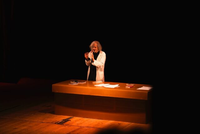 L’attore, vestito di nero ma con un camice bianco, ha cercato associazioni stravaganti e inaspettate, giochi di parole nonsense, per raggiungere effetti. Il suo teatro se la prende con i potenti, ridicolizza vezzi e convinzioni e non dimentica atrocità e sofferenze delle guerre. Ad aiutarlo nella rappresentazione soltanto un grande scatolone che funge da tavolo, sarcofago, bara in cui alla fine si seppellirà.