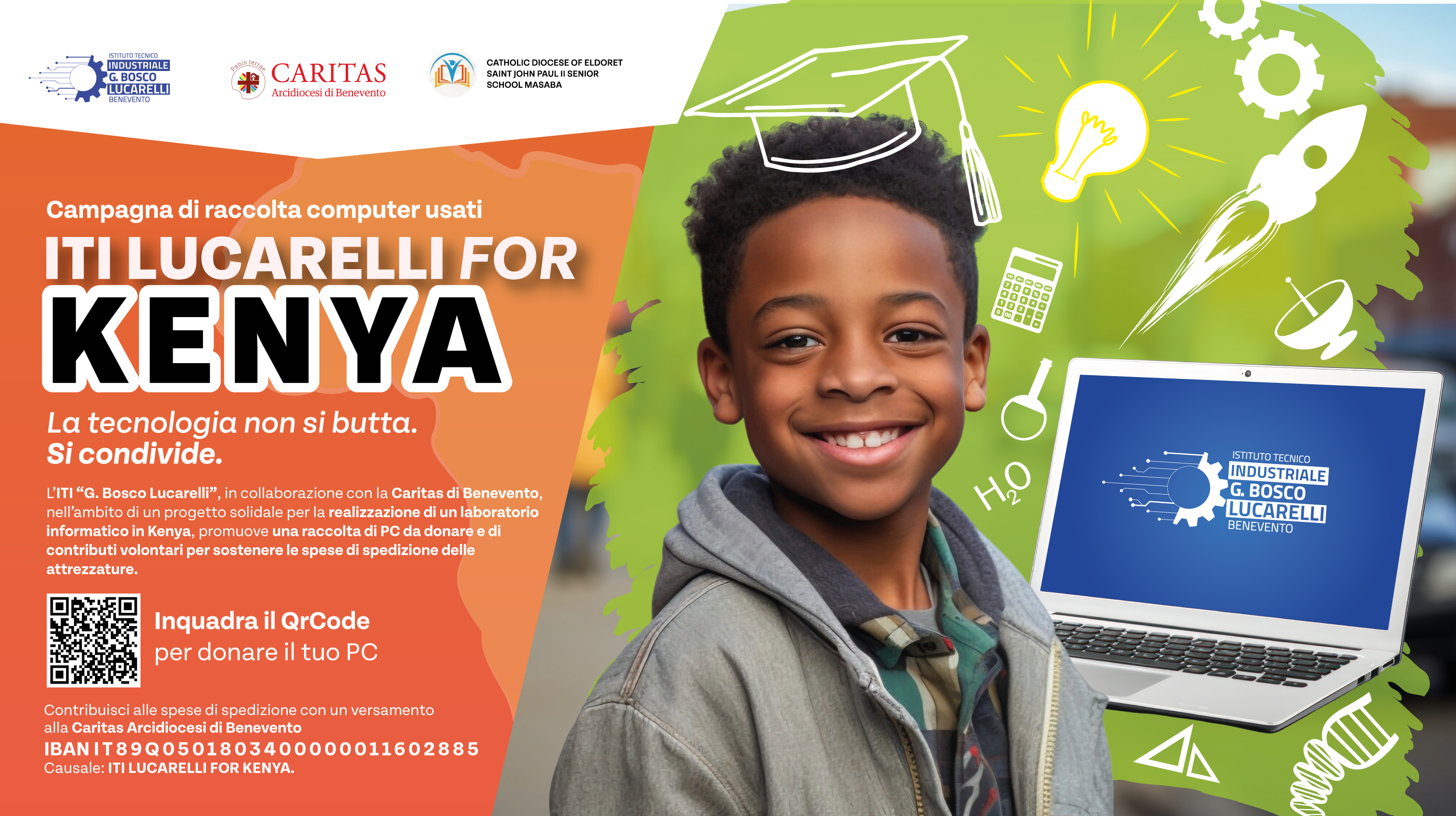 L’ITI “G. Bosco Lucarelli” di Benevento, da sempre attento ai temi della solidarietà e della cooperazione internazionale, promuove – in collaborazione con la Caritas dell’Arcidiocesi di Benevento – la campagna solidale “ITI LUCARELLI FOR KENYA”, un’iniziativa finalizzata alla raccolta di computer usati per la realizzazione di un laboratorio informatico in Kenya.